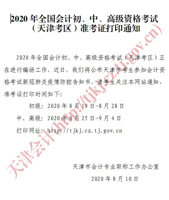 > 2026年高級(jí)會(huì)計(jì)師評(píng)審申報(bào)動(dòng)態(tài) > 天津市2020年高會(huì)考試準(zhǔn)考證打印時(shí)間8月25-9月4日