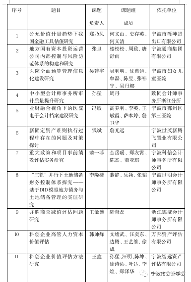 各區(qū)(縣、市)會計(jì)學(xué)會、會計(jì)師事務(wù)所、資產(chǎn)評估機(jī)構(gòu),有關(guān)單位: 根據(jù)寧波市會計(jì)學(xué)會、寧波市注冊會計(jì)師協(xié)會、寧波市資產(chǎn)評估協(xié)會《關(guān)于開展2022年度會計(jì)、評估科研課題研究的通知》(甬注協(xié)〔2022〕2號)及各單位申報(bào)情況,經(jīng)研究,現(xiàn)將2022年度立項(xiàng)的會計(jì)、評估科研課題印發(fā)給你們,并將有關(guān)事項(xiàng)通知如下: 一、請各課題依托單位于2022年12月31日前將研究成果報(bào)告,報(bào)送給市會計(jì)學(xué)會或市注冊會計(jì)師協(xié)會、市資產(chǎn)評估協(xié)會,屆時(shí)將及時(shí)組織優(yōu)秀科研成果評選。請按照要求提交課題成果紙質(zhì)稿件(一式7份)以及與紙質(zhì)稿件相符的電子文檔。 二、課題成果字?jǐn)?shù)要求原則上在5000-10000字之間。電子稿件一律用WORD文檔格式排版,紙質(zhì)稿件A4紙雙面打印左側(cè)裝訂;或A3紙型雙面打印,中縫裝訂。文字編排要求:標(biāo)題居中,三號宋體加粗,上下各空1行;“【摘要】”頂格五號黑體,摘要內(nèi)容五號宋體;“【關(guān)鍵詞】”五號黑體,關(guān)鍵詞內(nèi)容五號宋體,下空1行;正文四號宋體,單倍行距,文中標(biāo)題加粗,圖表分別按順序編號;正文引用文獻(xiàn)用上標(biāo)標(biāo)出,與文后所列參考文獻(xiàn)順序一致;“參考文獻(xiàn)”標(biāo)題五號黑體,參考文獻(xiàn)著錄內(nèi)容五號宋體。 三、課題成果名稱應(yīng)與立項(xiàng)課題名稱一致,不得隨意變更。確需調(diào)整的,課題負(fù)責(zé)人應(yīng)說明原因并經(jīng)課題申報(bào)單位蓋章確認(rèn)。 四、請各課題組恪守學(xué)術(shù)道德,遵守學(xué)術(shù)規(guī)范,確保課題研究成果不涉嫌抄襲、剽竊等學(xué)術(shù)不端行為。 五、各課題組所需經(jīng)費(fèi)可商依托單位按標(biāo)準(zhǔn)報(bào)銷或給予補(bǔ)貼。 六、聯(lián)系方式: 1.寧波市會計(jì)學(xué)會 聯(lián)系人:陳老師 電話:0574-89388212 地址:海曙區(qū)中山西路19號寧波市財(cái)政局1903室 郵箱:nbkjxh@163.com 2.寧波市注冊會計(jì)師協(xié)會、寧波市資產(chǎn)評估協(xié)會 聯(lián)系人:賀老師 電話:0574-89388306 地址:海曙區(qū)中山西路19號寧波市財(cái)政局501室 郵箱:1126991979@qq.com 希望課題依托單位精心組織,通過研究、分析、協(xié)作、討論等活動(dòng),進(jìn)一步提高科研水平、實(shí)務(wù)研究和服務(wù)社會能力??蒲谐晒嗅槍π院涂刹僮餍?,力求通過科研成果推動(dòng)我市會計(jì)、評估科研工作發(fā)展。 附件:2022年度全市會計(jì)、評估科研課題。 寧波市會計(jì)學(xué)會 寧波市注冊會計(jì)師協(xié)會 寧波市資產(chǎn)評估師協(xié)會 2022年8月23日 附件:2022年度全市會計(jì)、評估科研課題 .png)