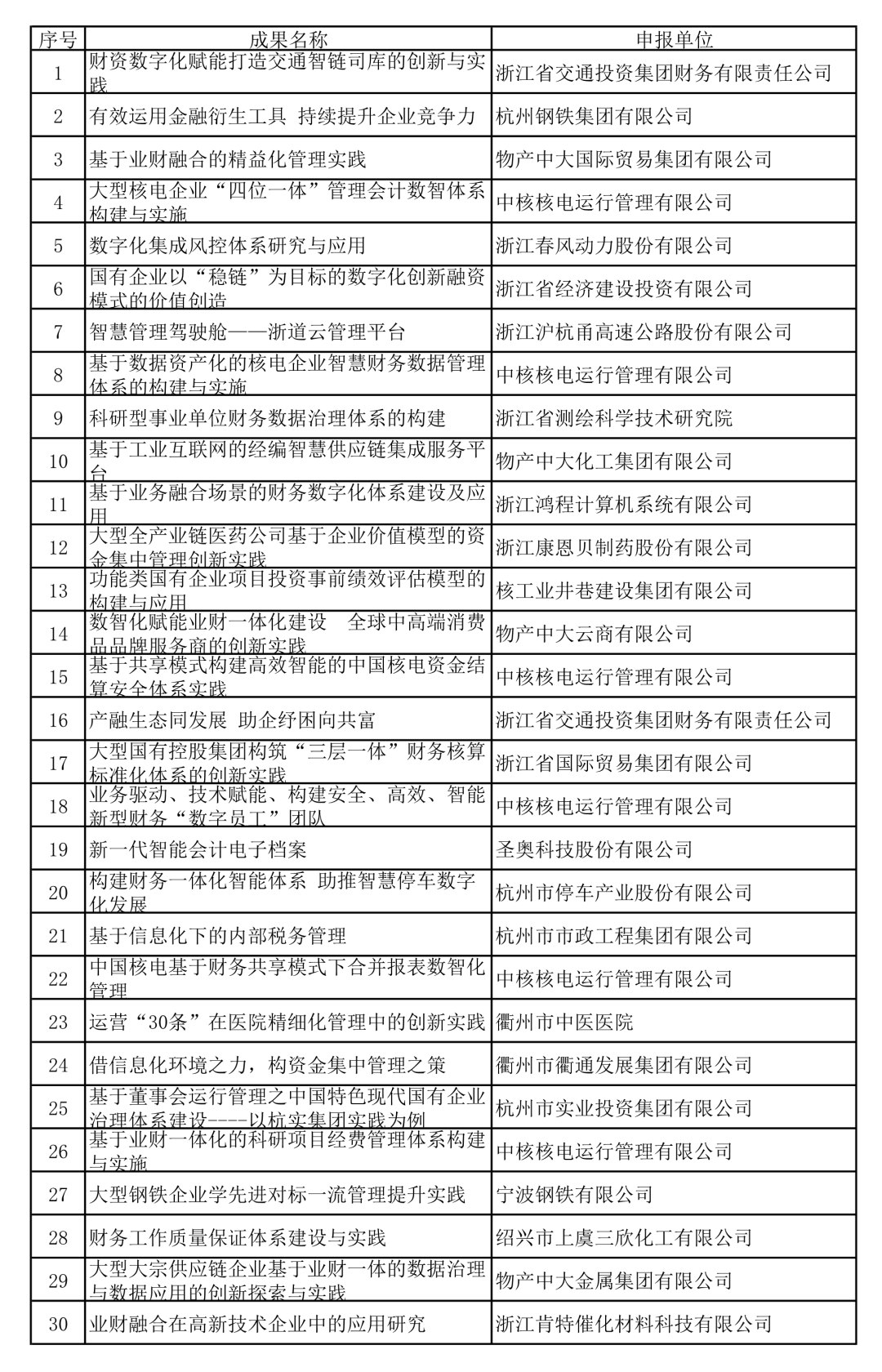 2023年度浙江省企業(yè)管理現(xiàn)代化創(chuàng)新成果(財(cái)務(wù)領(lǐng)域)的評(píng)審工作已于6月1日完成。經(jīng)專家評(píng)審并由評(píng)審委員會(huì)審定,有30項(xiàng)成果為擬獲獎(jiǎng)成果,現(xiàn)根據(jù)《浙江省企業(yè)管理現(xiàn)代化創(chuàng)新成果(財(cái)務(wù)領(lǐng)域)評(píng)審辦法》,將擬獲獎(jiǎng)成果進(jìn)行公示,公示期為5天(2023年6月2日至6月6日)。